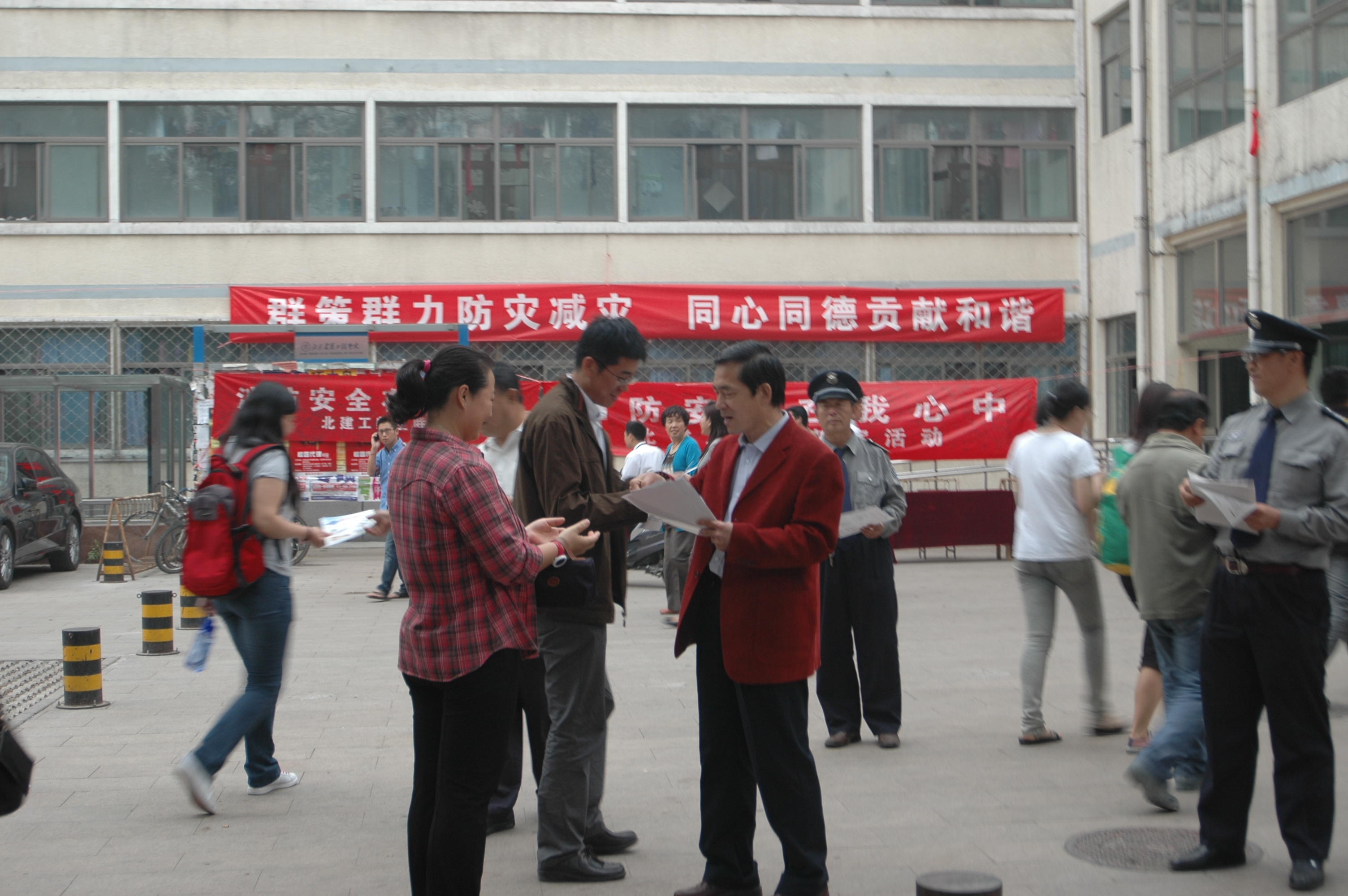 5月12日是我国第三个“防灾减灾日”,我校以坚持科学发展观为指导,以保障师生生命安全为根本,以进一步提高广大师生的交通安全意识、自我保护能力和紧急避险及自救能力为重点,保卫处在西城、大兴两校区组织开展了以“群策群力防灾减灾,同心同德贡献和谐”为主题的防灾减灾知识宣传周活动(5月9日—5月16日)。活动现场悬挂安全警示条幅,保卫处长带头在食堂门前向广大师生发放宣传材料,宣讲安全和谐的重要性。