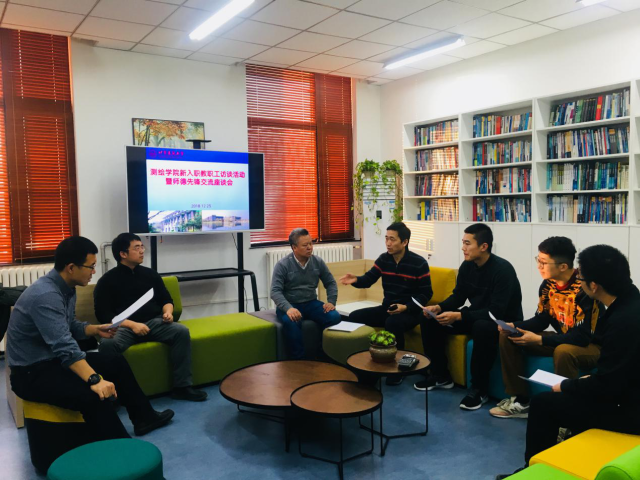 为深入学习贯彻全国和北京市教育大会精神,充分发挥学校优秀教师典型示范教育作用,帮助新入职教师树立职业理想信念和职业发展自信,传承弘扬建大师德师风,测绘学院于12月25日在学F图书阅览室开展新入职教职工访谈活动暨“师德先锋”交流座谈会,学院党委书记王震远、2018年校师德先锋周乐皆和新入职教职工参加此次座谈会,会议由王震远主持。