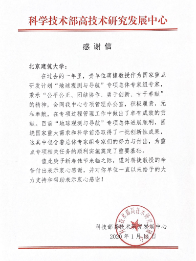 日前,科技部高技术研究发展中心向我校发来感谢信,对蒋捷教授和学校为国家重点研发计划“地球观测与导航”专项的辛苦付出和给予的大力支持表示肯定和感谢!我校测绘学院学术委员会主任蒋捷教授作为国家重点研发计划“地球观测与导航”专项总体专家组专家,在过去的一年里,在项目工作中积极履责,无私奉献,做出了卓有成效的贡献。目前,“地球观测与导航”专项总体进展顺利,围绕国家重大需求和科学前沿取得了一批创新性成果。在项目进行过程中,学校科技处、测绘学院等部门和单位给予了积极的支持。