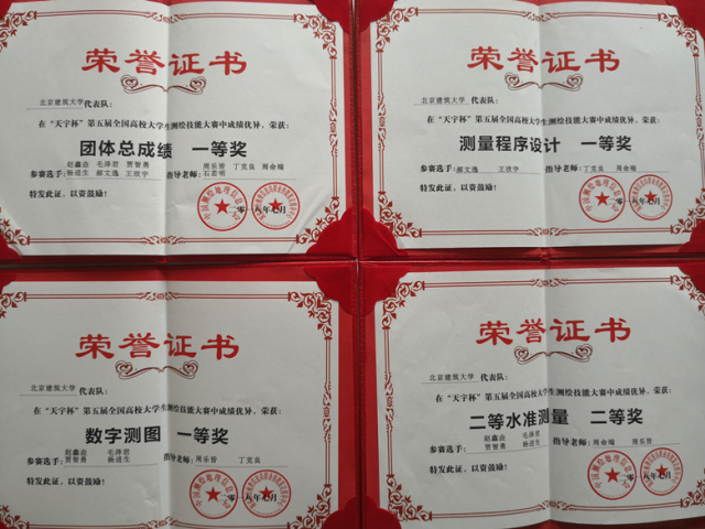 2018年7月20-25日,由教育部高等学校测绘类专业教学指导委员会、国家测绘地理信息局职业技能鉴定指导中心和中国测绘地理信息学会联合主办的“天宇杯”第五届全国高等学校大学生测绘技能大赛在东北大学举行。我校代表队以优异的总成绩获得团体一等奖。