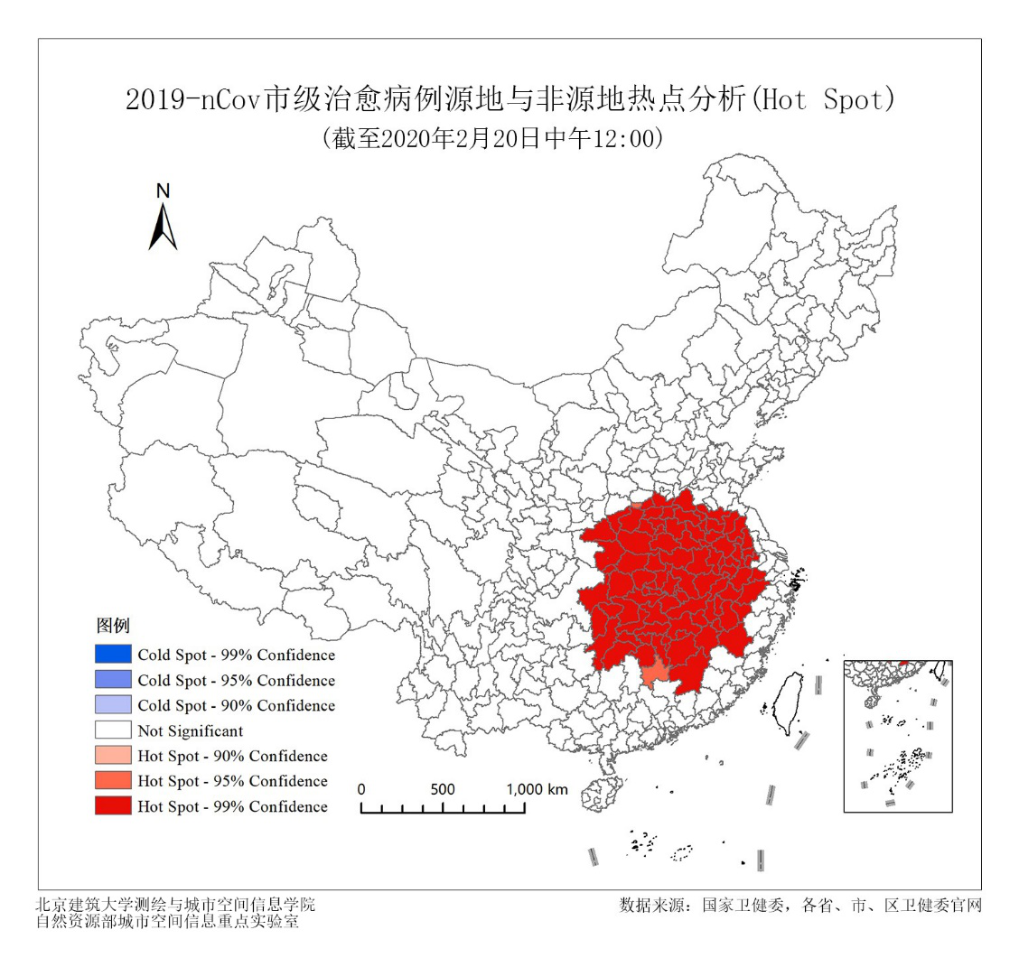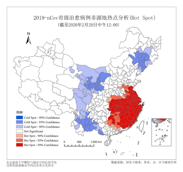 而在剔除了湖北各市的非源地热点分析结果中可以看到,东南各省仍然是热点区域。同时东北和西部的部分城市呈现了典型的非热点区域,表明这些地区内的治愈病例数量较少。这与这些地区本身累计确诊病例数量较少有关。具体如下图所示: