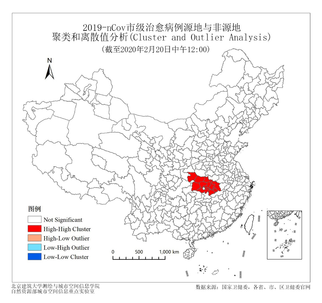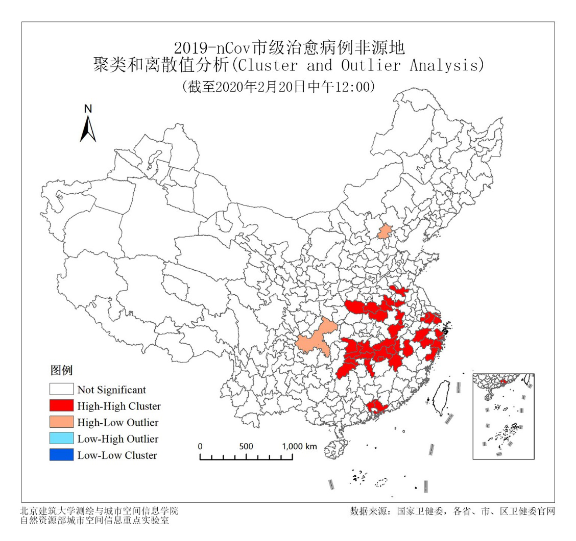 而在包含了湖北省各市的聚类和离群值分析中可以看到,除湖北省周边的各市外,长三角地区以及珠三角地区的部分城市以及北京市也呈现出高值聚集的现象,反映出这些地区有着数量较多的治愈病例。具体如下图所示: