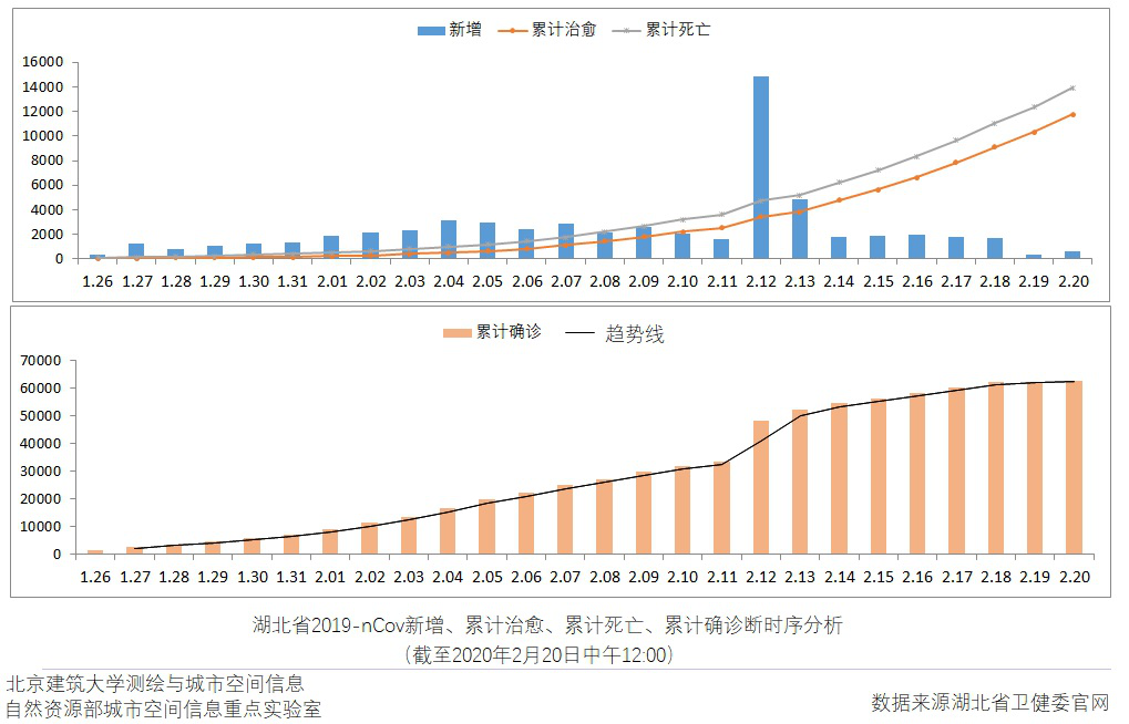进一步,分析了自1月26日湖北省新增、累计治愈、累计确证以及累计死亡病例的发展趋势。其中新增病例的数量在2月12日出现大幅增加,原因是该日推出了新版治疗诊断方案,将“临床诊断”纳入到新增病例的统计当中。随后,新增病例的数量开始出现下降趋势。从趋势线中也可以看到,2月12日之后增长趋势逐渐趋缓。同时在总体上,我们可以看到累计治愈的数量在持续上升。