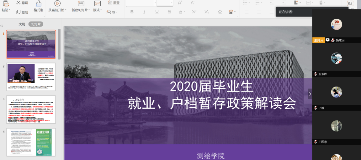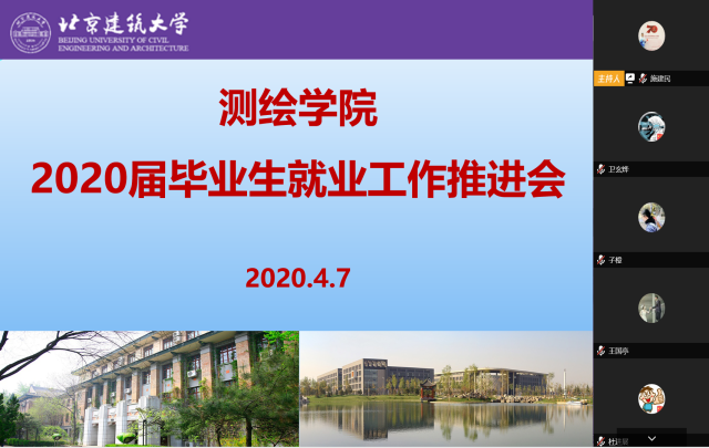 为深入贯彻落实《北京市教育委员会转发教育部关于应对新冠肺炎疫情做好2020届全国普通高校毕业生就业创业工作文件的通知》和学校关于做好疫情防控期间就业工作的要求,进一步加强毕业生就业指导和服务,扎实推进特殊时期的毕业生就业工作,测绘学院于4月7日和8日分别召开毕业生就业工作专题推进会和户档暂存政策说明会,就业指导中心负责人和相关老师、学院相关领导、老师及2020届毕业生参加会议。