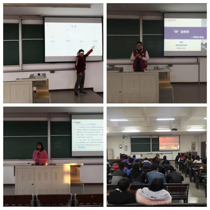 首先,2015级四六级高分学生朱晨曦、学生科研团队骨干成员江珊、2018级研究生胡博分别从英语四级学习、本科生进科研团队项目、考研准备要素三个方面跟同学们进行交流。他们精心准备,结合自身经历,把有益的经验、重要的“攻略”和针对性的建议娓娓道来,详尽讲述,现场同学获益匪浅。