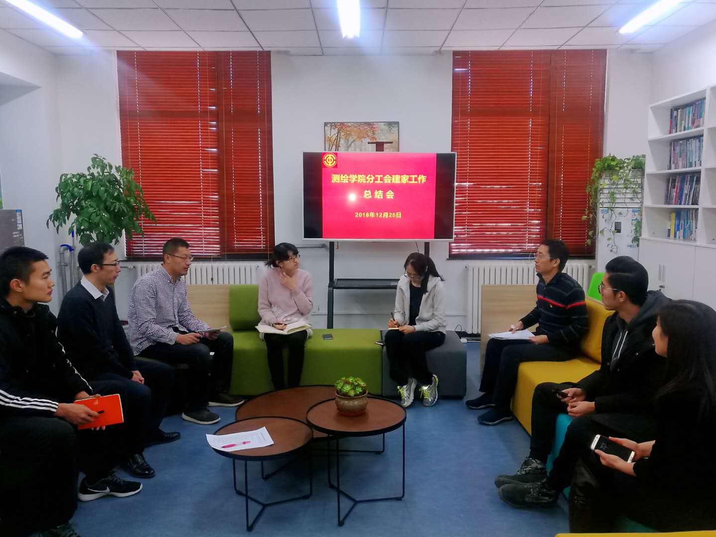 2018年12月25日上午,测绘学院分工会2018年建家工作总结会在学院楼F座533教工之家举行。会议由学院分工会主席、党委书记王震远主持,学院工会委员、工会小组长参加了会议。