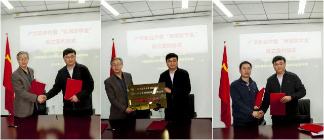 杜明义和徐继勇代表双方共同签署了产学研合作框架协议,王震远和徐继勇代表双方共同签署了“帝测奖学金”设立协议,帝测公司向测绘学院授牌“产学研合作基地”,双方的全面合作正式开启。