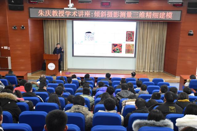 聘任仪式结束后,举办了朱庆教授专题学术报告会。朱庆教授结合不同的三维建模途径,针对倾斜摄影测量建模的国内外研究现状与发展趋势,提出了倾斜摄影测量关键问题,并重点介绍了围绕关键问题研究的算法成果和工程实践应用效果。最后提出面向更有针对性和精细化的数字地表建模,倾斜摄影测量技术正向智能化、自动化、低成本的方向快速发展,倾斜摄影测量与LiDAR和3DGIS等集成应用将有力支撑数字城市和智慧社会的建设。