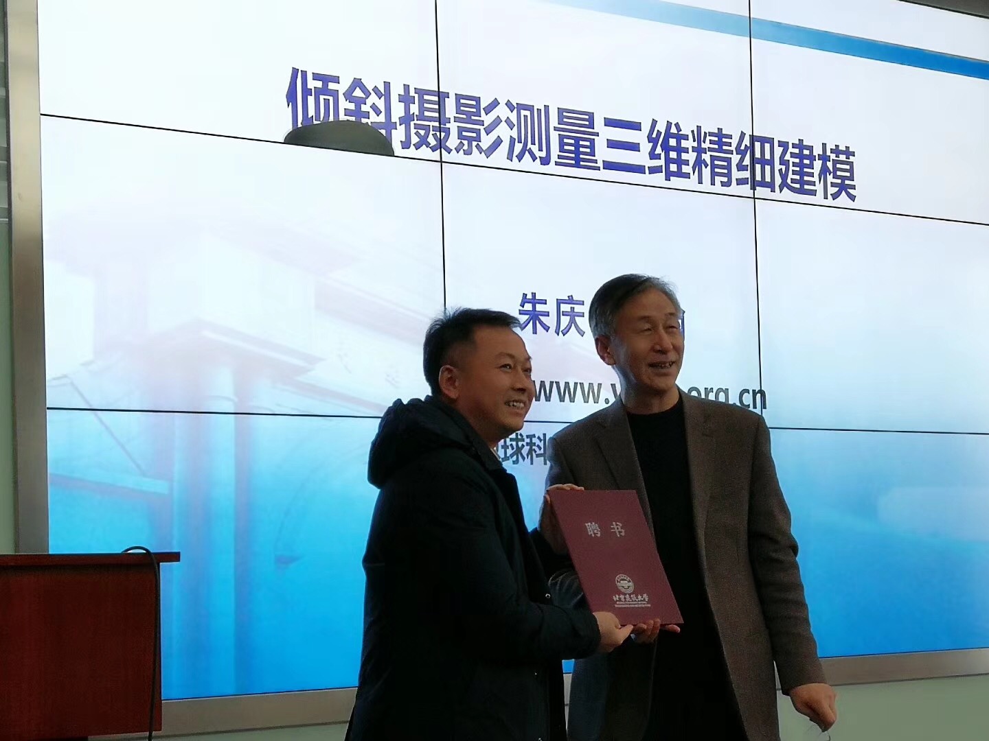 鉴于朱庆教授在摄影测量与遥感领域的杰出贡献和国际影响力,以及长期以来对我校测绘学科的帮助和支持,经学院申请,学校批准,测绘学院院长杜明义教授首先代表学校,宣读了学校聘任朱庆教授为“荣誉教授”的决定,并向朱庆教授颁发了聘任证书。