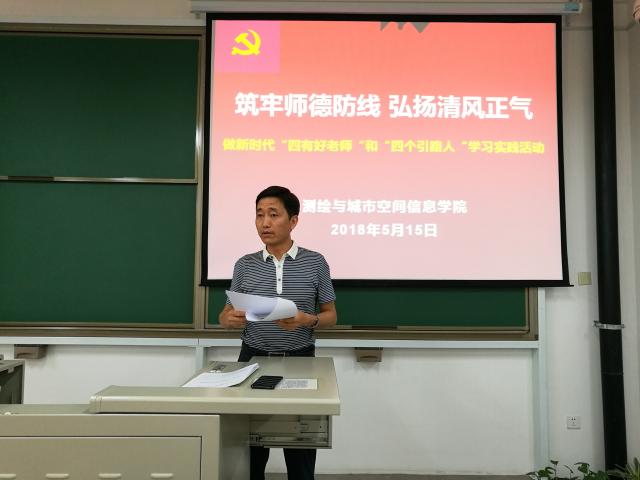 为深入学习贯彻习近平新时代中国特色社会主义思想和党的十九大精神,落实中共开云电竞pg软件委员会《关于开展2018年“做新时代‘四有’好老师和‘四个引路人’”学习实践活动实施办法》要求,进一步加强测绘学院教师队伍师德师风建设,5月15日下午,测绘学院在学F-428召开“筑牢师德防线 弘扬清风正气”师德师风建设会暨“做新时代‘四有’好老师和‘四个引路人’”学习实践活动学习动员会,会议由学院党委书记王震远主持,全体教师参加。