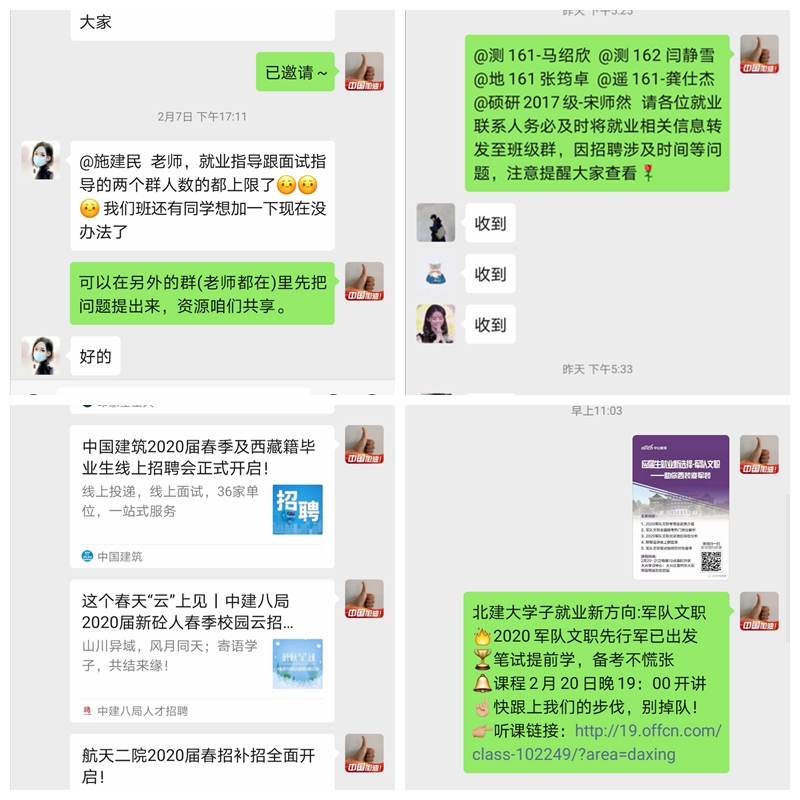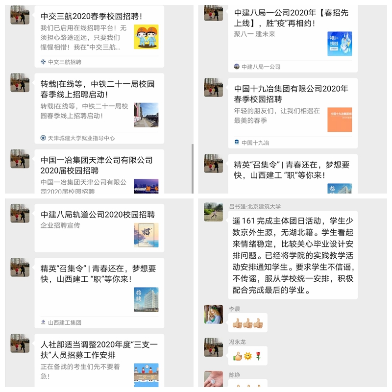 面对当前疫情,学院通过就业工作微信群、全院教职工视频会等形式针对毕业生就业问题进行部署和安排。就业辅导员及时将各类招聘信息转发至学生,学院积极与有关重点用人单位、就业指导机构沟通联系,开展一系列在线招聘、网络推荐和云端指导。