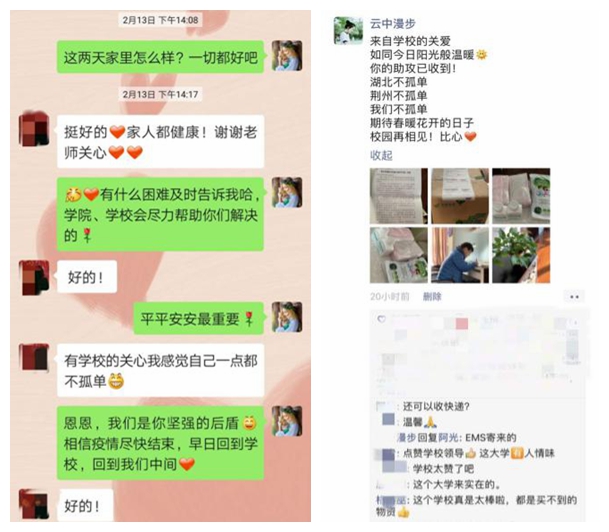 学院安排辅导员、班主任、研究生导师联系每一名同学,全面、实时、动态掌握疫情防控期间的情况,耐心解答同学们的问题,提供引导、支持和帮助;学院建立湖北籍学生交流群,针对湖北籍学生建立一对一的应对机制,学院班子成员“温暖连线”湖北学子,向同学们送去慰问和祝福;积极开展教师党支部和学生党支部、学生班级“一对一”帮扶工作,全面覆盖5个学生党支部、19个学生班级;给学生寄送必要的学习用品、口罩,为困难学生申请临时困难补助及流量费用,持续关注学生需求,有困难第一时间予以解决;对心理方面存在较大困扰的学生,会同心理素质教育中心制定针对性帮扶措施;高度关注毕业生就业工作,专题研究疫情期间学生就业问题,全方位、全程化、全覆盖为毕业生提供线上就业指导、服务和推荐工作,促进毕业生就业、考研复试、出国留学等事项顺利进展。