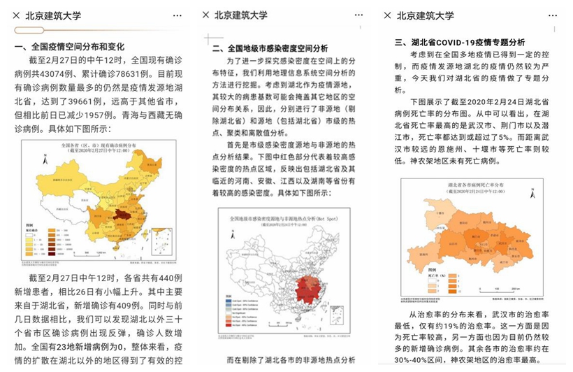师生们充分结合自己的专业优势,依托空间信息技术,发挥地理信息系统空间分析的优势,进行疫情蔓延分析,制作专业的疫情防控地图,并形成了“Bucea_图说疫情”精品系列。师生们用专题地图记录这场伟大的战役,用图片诉说人民群众动人的抗疫故事,激发了爱国热情,凝聚了奋进力量,提升了思政教育实效。