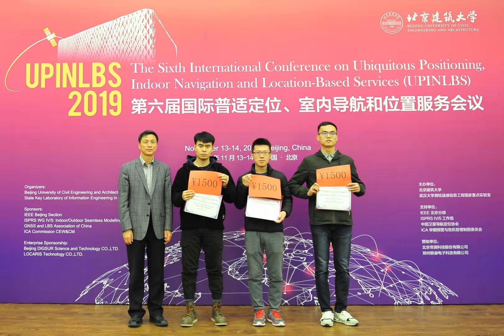 通过在现场数据解算和竞赛评审委员会评审,最终来自武汉大学胡鑫组、开云电竞pg软件杨燈组和北京航空航天大学魏海松组3个团队分别获得本次比赛INS、UWB和蓝牙组特等奖。同济大学刘骝组等6支参赛队伍获得一等奖,国防科技大学李晓宇组等9支参赛队伍获得二等奖。我校参赛队伍在该项赛事中取得了一个特等奖、两个一等奖的好成绩。在UPINLBS会议中,对获奖团队进行了表彰,我校张爱林校长和有关行业协会、企业负责人为获奖团队颁奖。