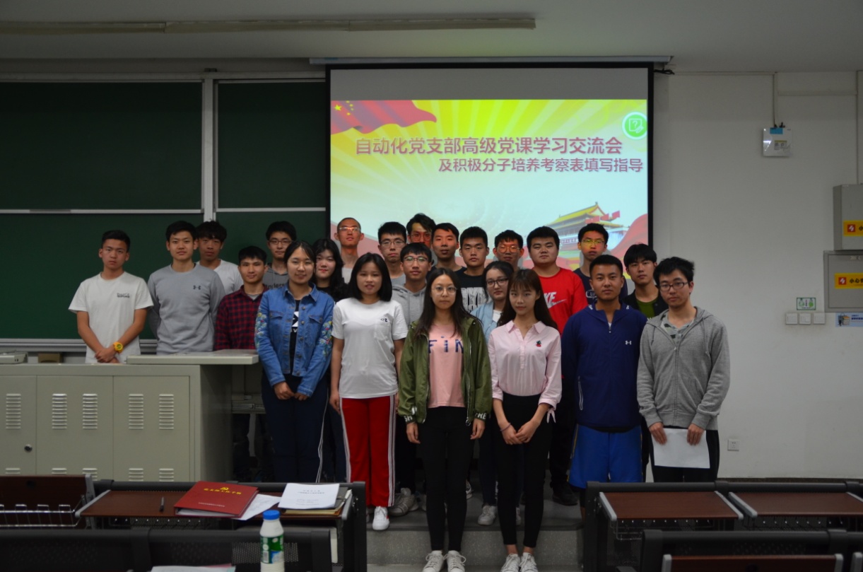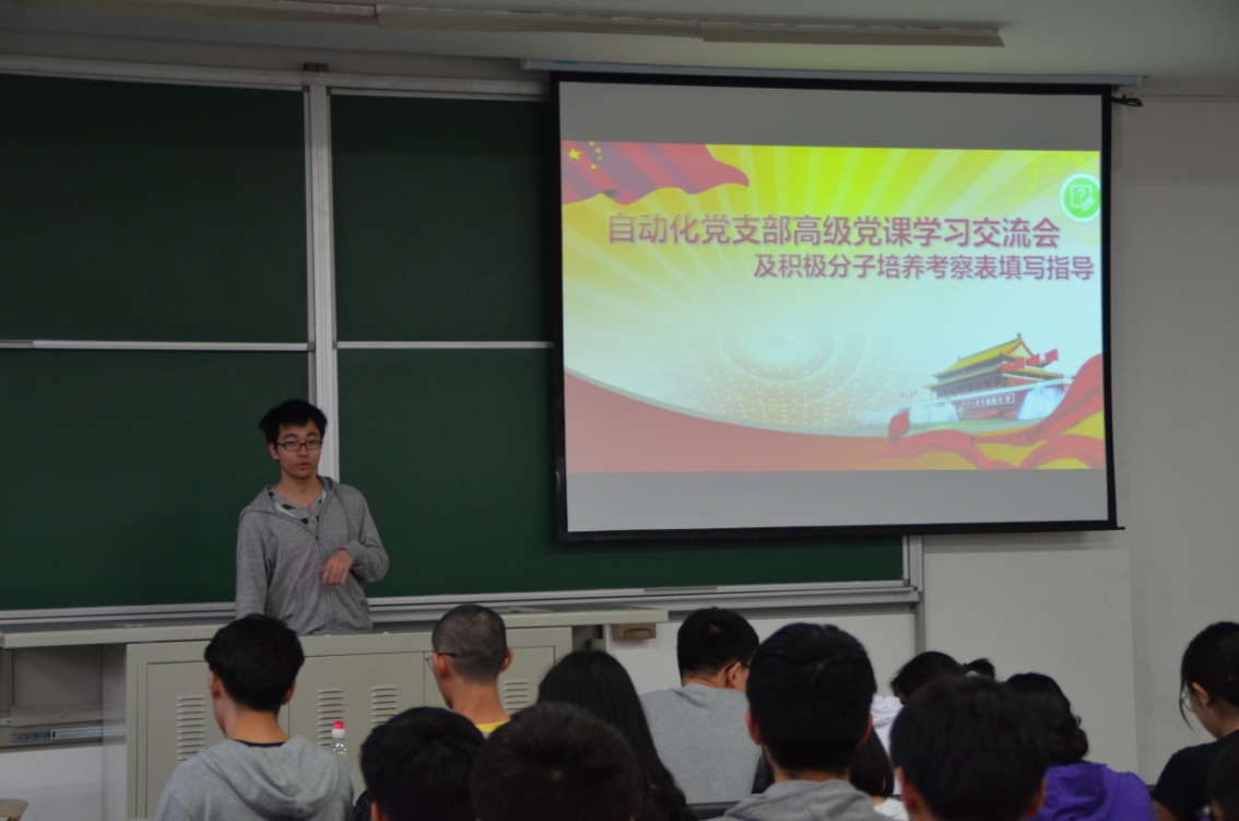 4月27日晚上18:30,电信学院自动化专业本科生党支部在基础楼A座115教室召开高级党课学习交流会,支部党员及本专业参加第61期高级党课培训班学员参会,会议由支部党员王陆天主持。