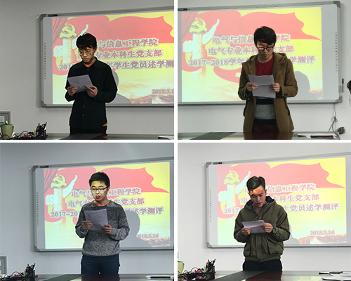为进一步加强对大学生党员的教育管理,增强大学生党员的党性党风党纪教育,保持党员队伍先进性和纯洁性,更好地发挥大学生党员的先锋模范作用,新学期伊始,根据学校统一部署和安排,电信学院电气专业本科生党支部于2018年3月14日在学D542会议室召开学生党员述学测评会。本次测评会特邀电气专业教工党支部书记马鸿雁、支部党员所在班级的学生代表参加并给予评议。会议由电气专业本科生党支部书记高静主持。