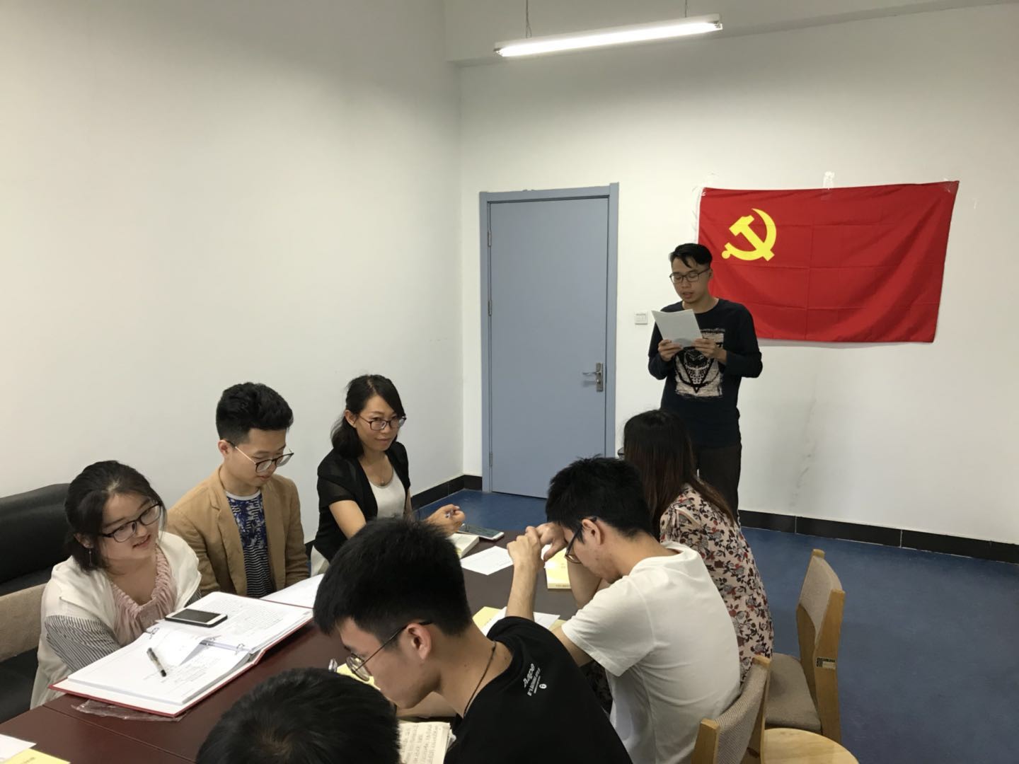 会议伊始,全体起立,面向党旗,奏唱国际歌。