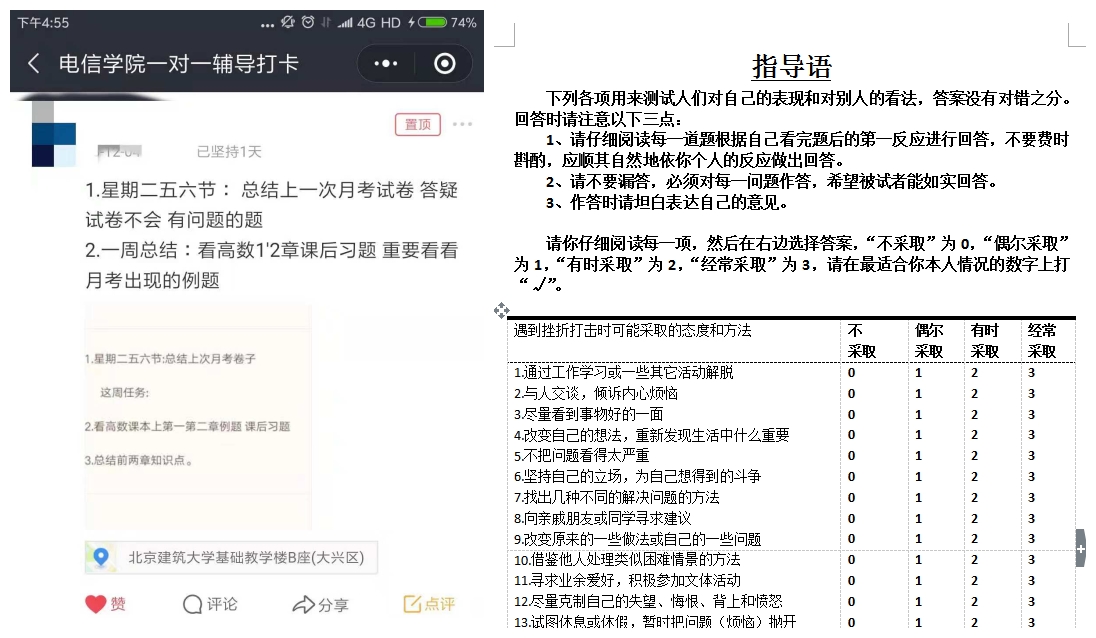 为了更好提升过程管理,辅导利用网络平台进行小组打卡。各小组按照制定的学业计划,进行打卡,督促学习进程。另外,为了更好的了解同学们的学习情况,提升学业辅导服务的针对性,同学们也填写了相关问卷。