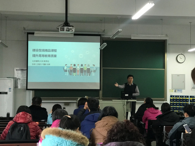 2019年1月15日,电信学院邀请教务处副处长张军进行了“在线精品课程建设”专题培训会,电信学院全体领导和教职工参加本次培训。培训主要从在线课程建设意义、我校在线课程现状以及在线课程标准与技术支持三个方面进行了专题辅导。