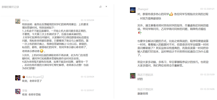 部分学生在上机课上的问题可能没法及时得到老师的反馈,难免产生焦虑情绪,担心自己学不好学不会。了解到这个情况后,张勉老师多次在课堂上强调课程资料获取方式,提醒同学们可以在课前错峰下载。同系的张昱老师也在微信群负责答疑,两名老师几乎24小时在线,鼓励学生线下自主学习,学生有问题只要问了,都会得到回答。张勉老师说通过增加线下答疑来补充在线上机时间的不足,确实工作量增加了很多,不过学生只要问出问题来,熬夜解答也高兴。
