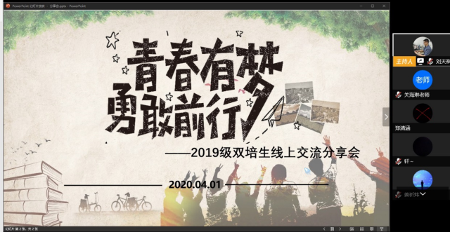 为帮助双培学生更好更快地适应在培养院校的学习生活,同时增强双培学生对北建大的归属感,4月1日下午,电信学院组织召开“青春有梦 勇敢前行” 主题线上交流分享会。学院党委副书记关海琳、副院长马鸿雁、19级部分班主任、辅导员和教务员,16级双培学生代表, 19级北航、北理、北交双培全体学生参加活动。交流会由学院分团委书记田奔主持。
