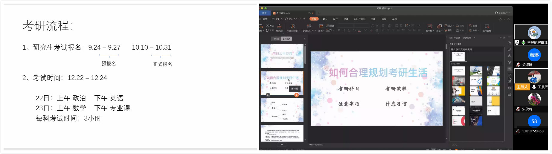会上辅导员王景民介绍了学院近三年的考研情况,通过历年情况的说明,帮助备考学子在考研中为自己立好Flag。2016级优秀考研学子李若凡和李昊同学从考研规划、详细科目的备考经验、心态调整等方面详细介绍了自己的备考心得。