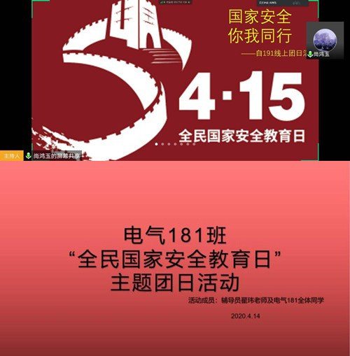 4月15日,是我国第五个“全民国家安全教育日”。为深入学习贯彻习近平新时代中国特色社会主义思想,坚持总体国家安全观,着力防范化解重大风险,结合新冠肺炎疫情防控的形势任务,电信学院在“4.15”前后组织开展“国家安全 你我同行”线上主题团日活动。