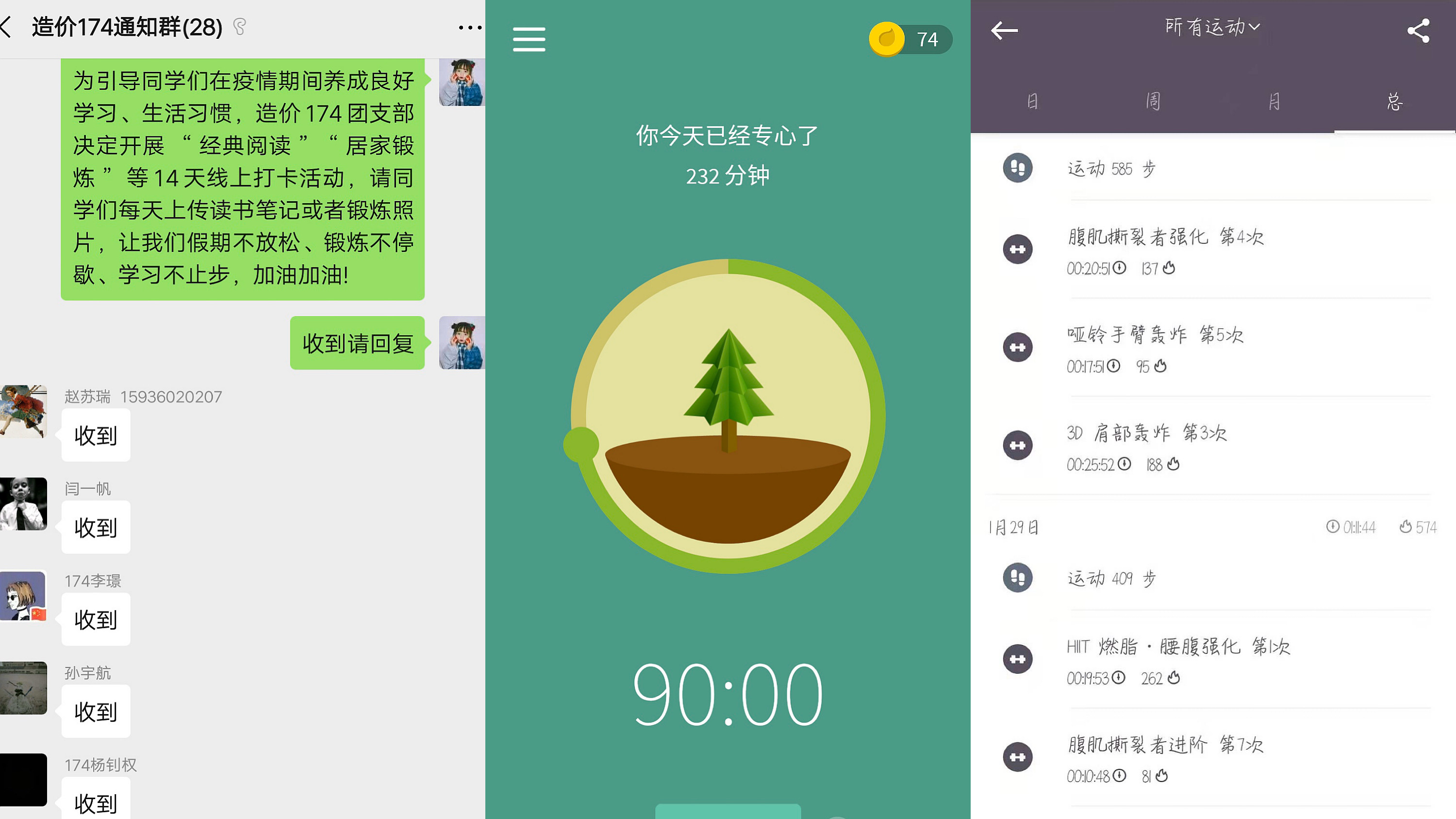 造价174团支部开展 “经典阅读”“居家锻炼”等14天线上打卡活动,引导同学们在疫情期间养成良好学习、生活习惯,保证同学们假期不放松、锻炼不停歇、学习不止步。