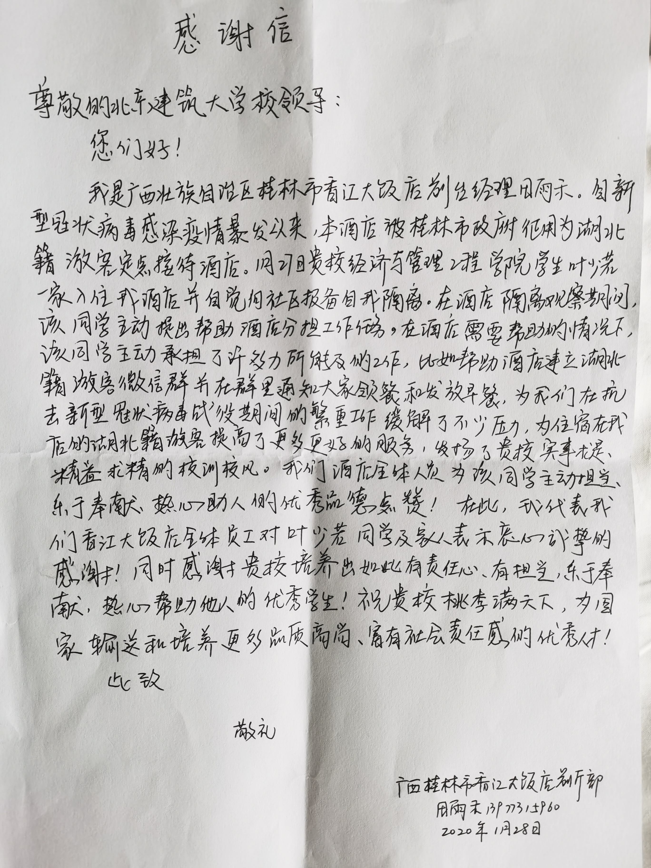 经管学院工商管理专业学生叶少若来自此次疫情最严重的湖北省。过年期间,正在桂林市与父母游玩的她,美好的旅程被一场突如其来的疫情所打断。在桂林市政府安置湖北籍游客的定点酒店隔离时,她看到酒店工作人员人手紧张,便主动挺身而出,帮忙每天分发早餐以及慰问品,并建立微信群安抚湖北籍游客的紧张情绪,传播正能量。她偶尔会因为疲惫和家乡疫情的消息而焦虑不安,不过,当想到自己曾是一名军人,想到同乡们对她的鼓励和感谢,她就信心满满,继续投入到紧张忙碌的工作中,用良好的精神面貌感染着每一位人,向大家传递着坚决打赢疫情防控攻坚战的必胜决心,赢得酒店工作人员和湖北籍游客的一致好评,她的典型事迹被当代广西杂志社官方微信宣传报道,展现了良好的北建大学子风采。