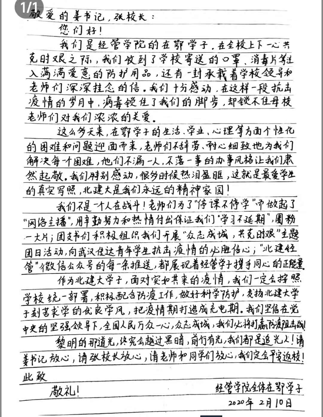 近日,学校向全体湖北籍学生邮寄了包括一封关爱信、鼓劲的校歌歌词以及防护口罩、消毒片等防疫物品在内的爱心邮包,在冬日严寒中为学生送去了春的温暖,传递了全校师生对湖北地区师生的关心关爱。身处疫情严重地区的湖北学子们,收到学校的爱心邮包后,经管学院16名在鄂学生决定联合给母校回信报平安,执笔人为湖北临时团支部组织委员陈腾达。