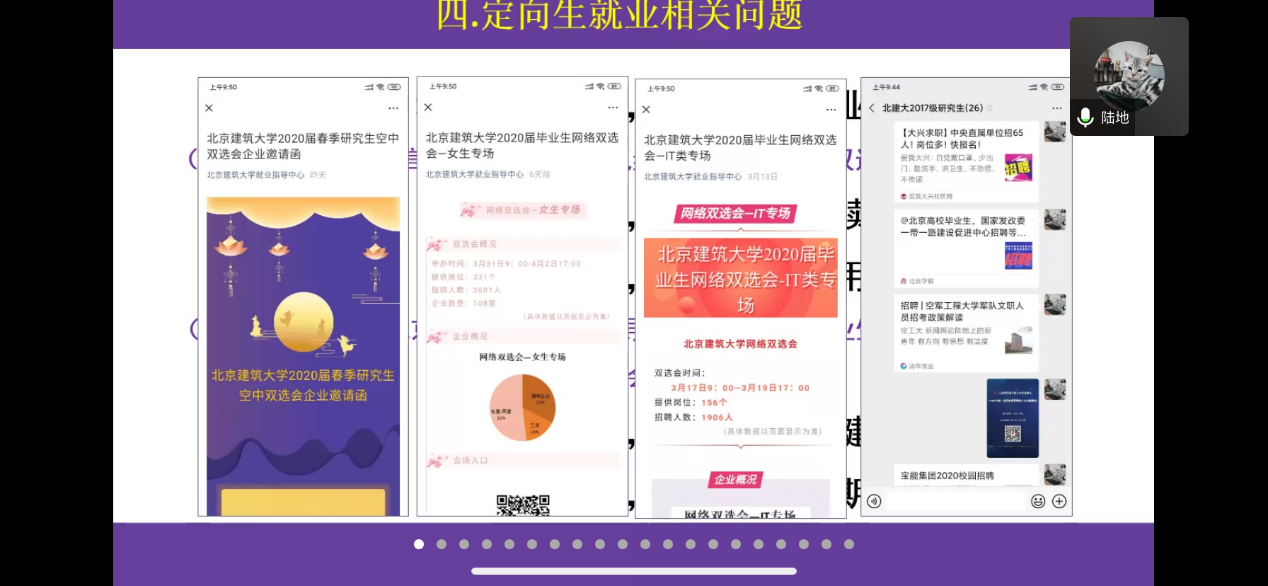 最后郝迈书记和陆地老师就2020届学生的就业流程及就业政策进行了详尽说明,针对今年疫情的特殊情况,学院为同学们提供了就业群、微信群宣讲、视频空宣等多种方式的招聘渠道,也建议同学们利用多方资源,如北建大就业网、其他相关高校就业网等渠道获取招聘信息。最后还针对就业进度对毕业生进行了逐一摸排,对有困难的学生进行重点帮扶。