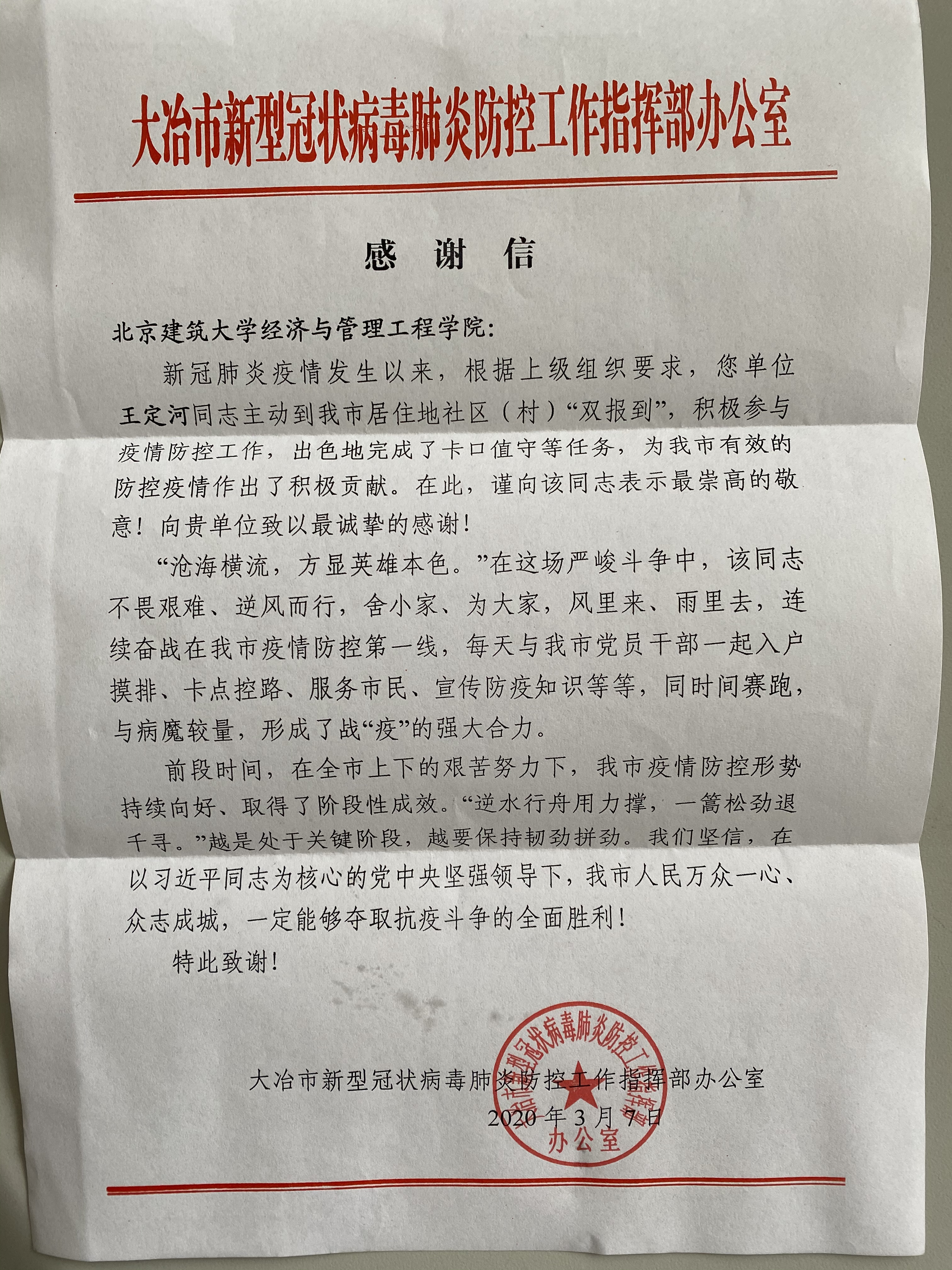 大冶市新冠肺炎防控工作指挥部向经管学院发来的感谢信