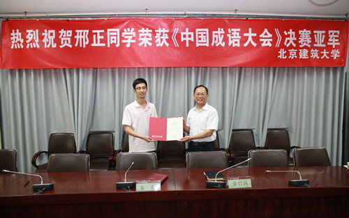 7月9日,学校为在《中国成语大会》中获得亚军的邢正同学颁发特别奖学金。校领导朱光、张启鸿,宣传部、学工部、经管学院、团委等部门领导,和校学生会代表出席了颁奖会。