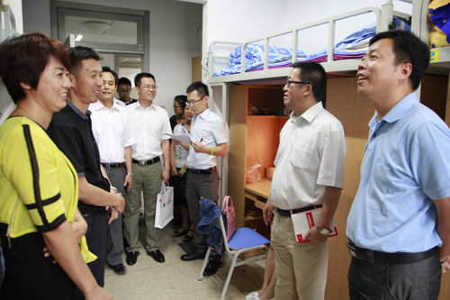 报到当天下午学院领导陪同校领导查看我院新生宿舍