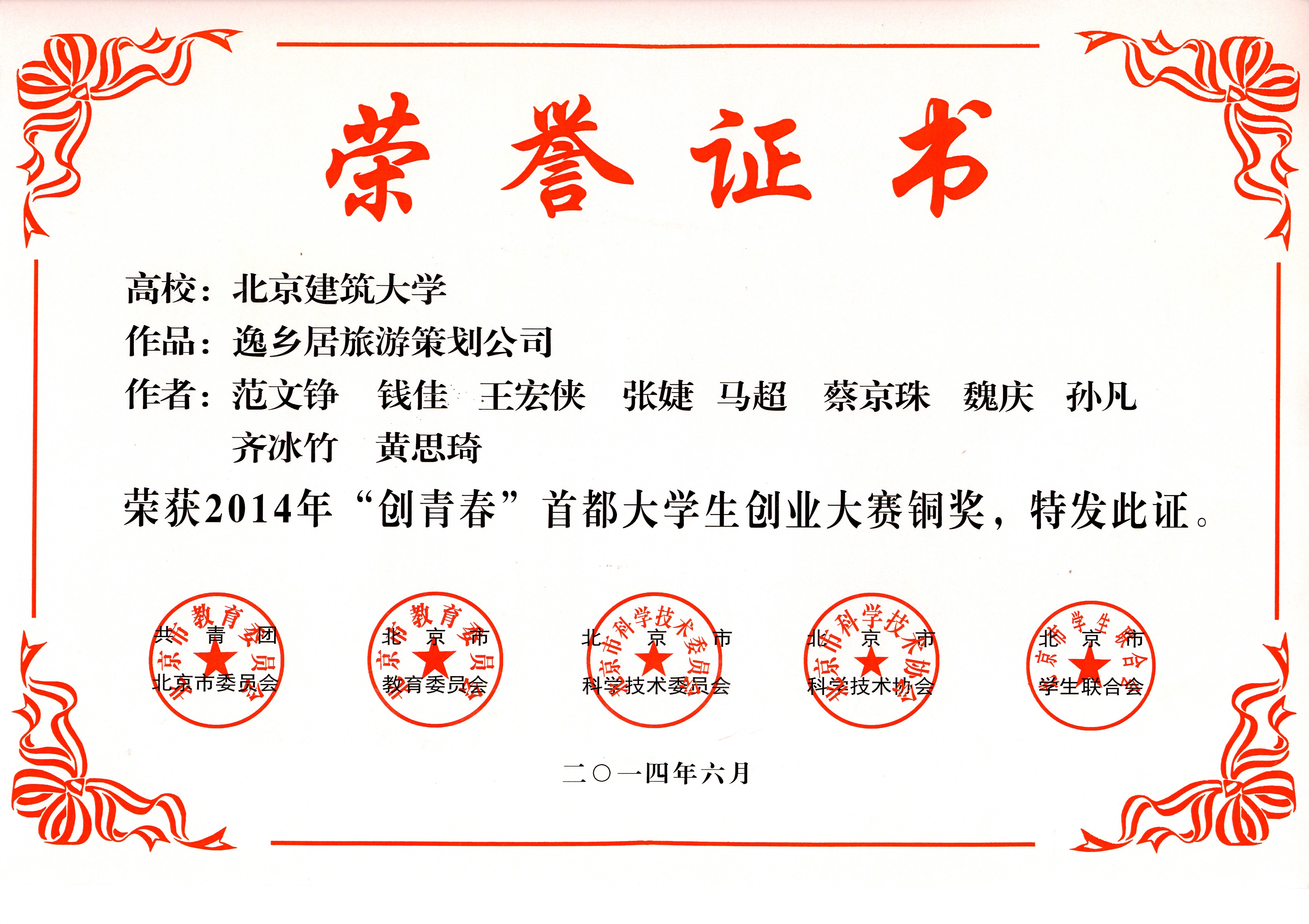 近日,2014年“创青春”全国大学生创业大赛复赛结果传来捷报。来自北京11所高校的18件作品入围全国大学生创业计划竞赛终审决赛。近180位北京高校学子将赴湖北武汉参加此次盛会。我院魏庆、孙凡、张婕等同学的《逸乡居旅游策划公司》获铜奖。