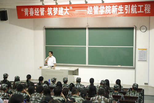 为了帮助2014级学生进一步熟悉学校和学院,尽快实现角色的转化,顺利适应从高中到大学生活学习的适应。经管学院于2014年9月19日下午2点在大兴校区学院楼A座101教室,召开“青春经管,筑梦建大”为主题的新生引航工程大会。出席活动的有经管学院院长姜军、党总支副书记魏强、教务员刘玥、2014级辅导员曹晓云和2014级全体本科生。