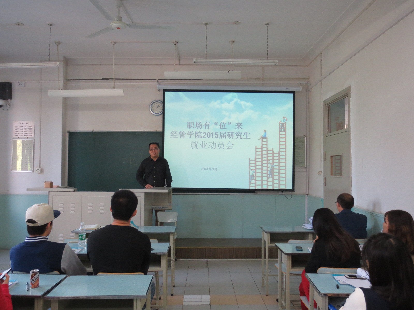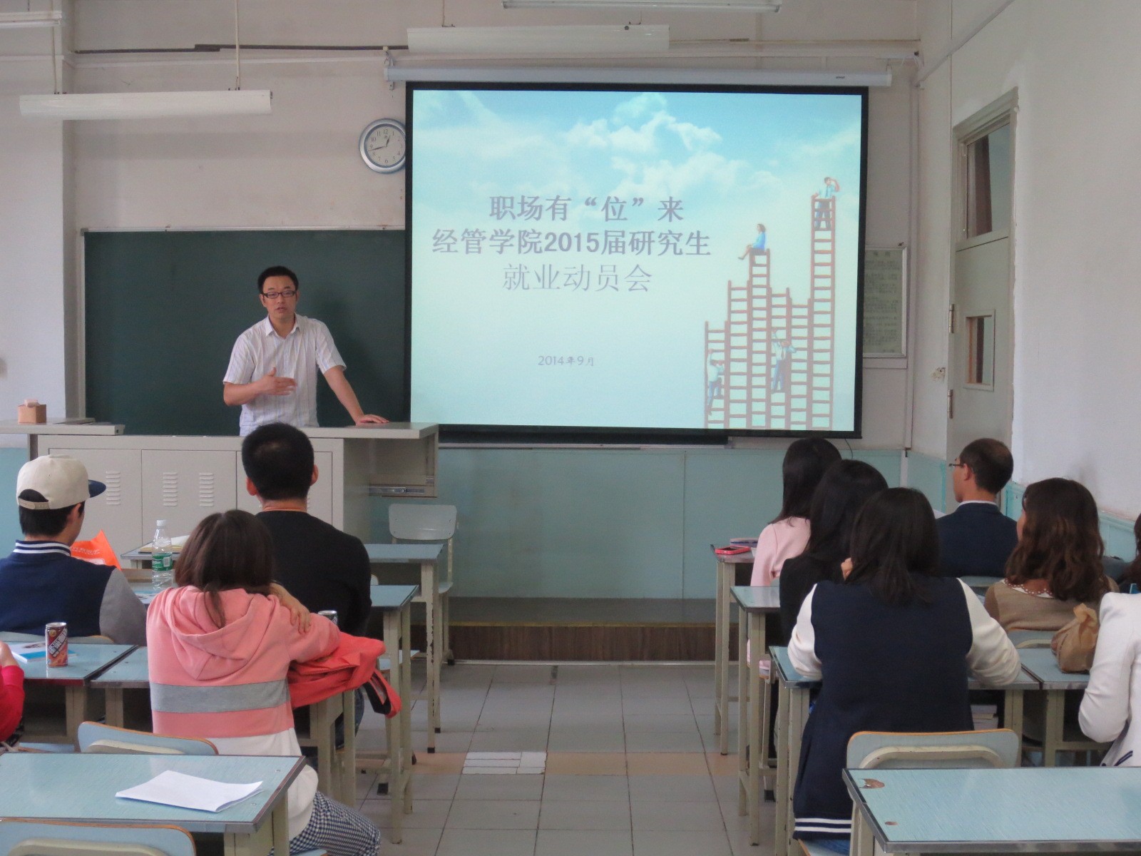 经管学院为进一步调动2015届研究生就业积极性,于9月29日中午,在西城校区教一206召开了2015届研究生就业动员会。与会人员有:经管学院院长姜军、研工部就业指导中心老师王子岳、经管学院就业辅导员左一多以及经管学院2015届研究生。