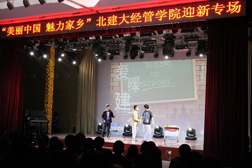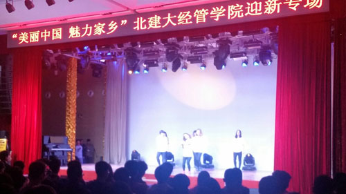 本次迎新专场分为两个部分,第一部分:美丽中国, 文艺演出;第二部分:魅力家乡,风采展示。在文艺演出中,同学们上演了精心准备的节目,街舞《舞动青春》展示了青年学生的活力;民谣《斑马斑马》、《稻香》为大家带来独特的听觉效果;话剧《爱暖建大》,以独特的视角向同学们阐述了文明宿舍的创建是你我他共同努力的结果;太极拳《中华魂》为全场观众展现了传统武术的灵魂,民乐表演《杨柳》让大家欣赏到了民族音乐之美。