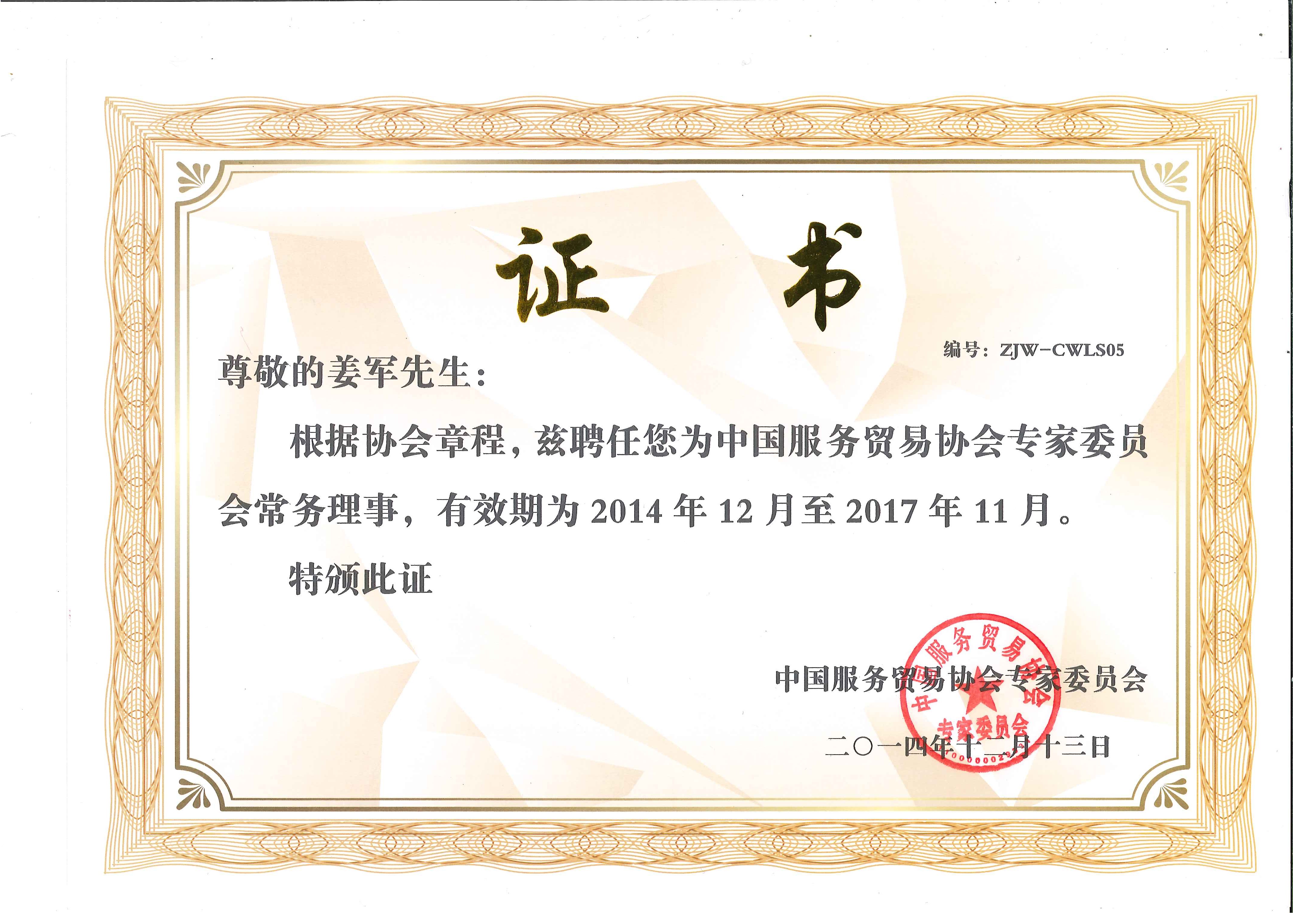 在这届年会上,根据《中国服务贸易协会专家委员会章程》,聘任姜军院长为中国服务贸易协会专家委员会常务理事,有效期为2014年12月至2017年11月。