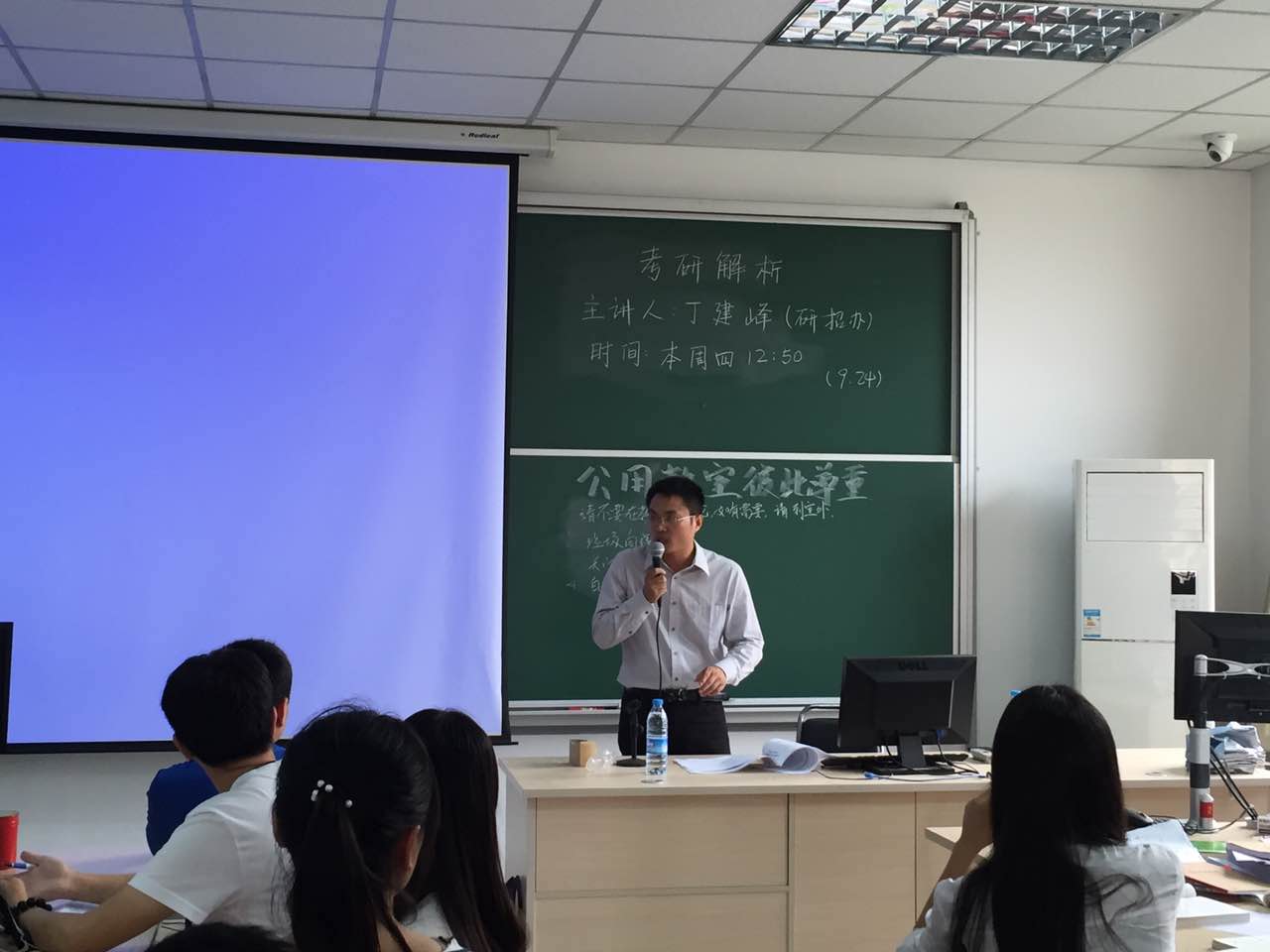 为了使考研的学子们在即将到来的研究生考试报名中夺得先机,更加准确有效的理解招生大纲和各种报考信息,经管学院专程邀请校研招办丁建峰老师于2015年9月24日下午,在大兴校区学A204(经管学院考研自习室)举办了2015年考研报名指导讲座。参与讲座的还有经管学院就业辅导员左一多老师以及经管学院准备参加2015年考研报名的考生们。