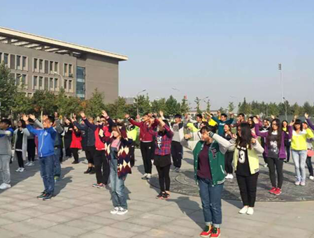 经管学院积极响应学校号召,倡导“每天运动一小时”理念,10月8日起就积极组织“两操”活动,组织学生进行晨跑和做课间操。 经管学院做课间操地点选在鲁班广场,寓意学生们像朝阳般富有青春的活力。10月15日9点35分,沐浴着金秋阳光,伴随着清脆的下课铃声,我院2014级、2015级学生在各班体育委员的组织下,迅速在鲁班广场集合完毕,会操队形排列整齐,在轻快柔和的韵律中做起了第九套广播体操。同学们整齐划一的动作、昂扬抖擞的精神状态,瞬间与美丽的建大校园融为一体。