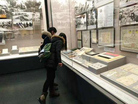 雨雪交加的日子里,同学们的心情同天气一样凝重。宛平城下的石碑,就这样默默地的躺着,那是曾经守卫宛平城革命先烈不朽的身躯。步入馆内,展厅正中央是威严肃穆的革命先辈巨幅雕塑,它不同于主题馆内展出的一幅幅照片,让人那样的触目惊心,也不像那一件件见证历史的文物,给人如此强烈的心灵震撼。驻足在三维模拟场景前,我们仿佛被带回到那个枪林弹雨的年代——东北抗联、保卫华北、地道战、狼牙山五壮士、台儿庄大捷、杨靖宇、赵一曼、放牛娃王二小,这一幅幅图片、一段段文字、一个个雕塑都向我们讲述着那些可歌可泣的辛酸史。