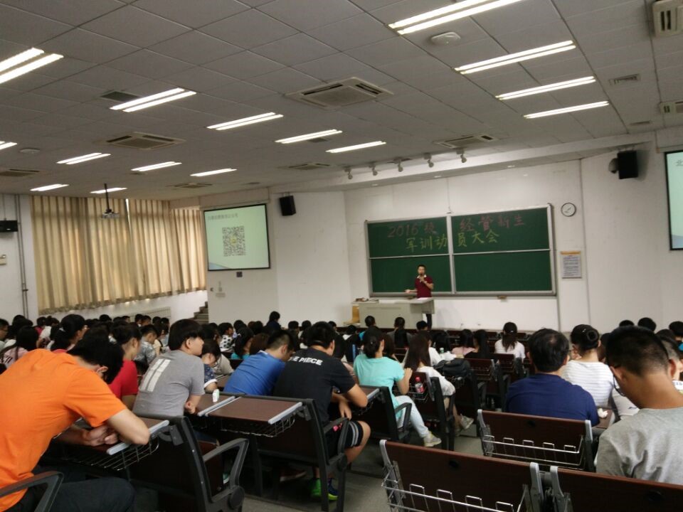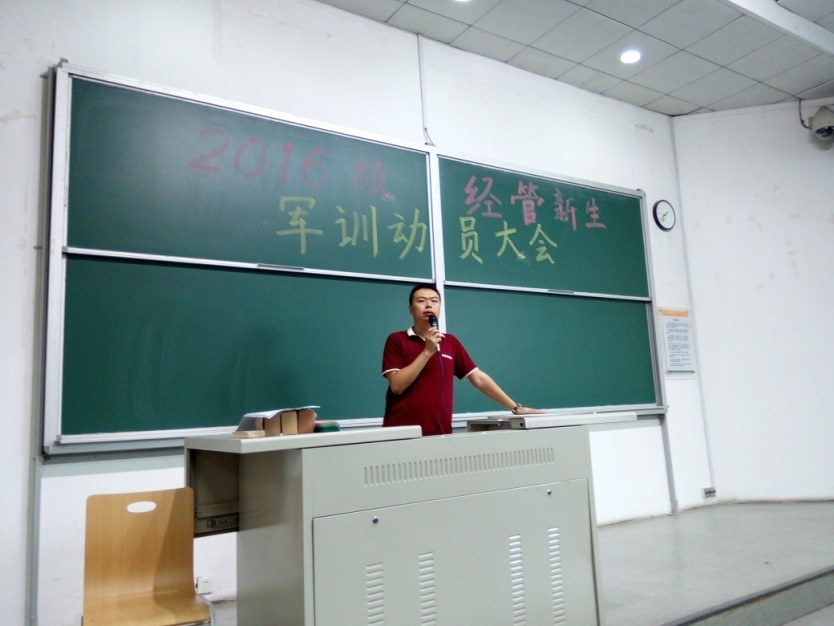 为动员新生的军训思想,2016年9月4日下午1点,经管学院2016级全体新生参加了在学院楼A座101召开的2016级军训动员会。会议由2016级辅导员王嫣然老师主持,院党委副书记郝迈老师出席了动员会。