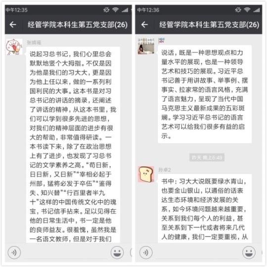 会后支部委员向全体党员传达了习近平总书记的重要批示,要求大家认真学习《关于新形势下党内政治生活的若干准则》、《中国共产党党内监督条例》,深刻领会习近平总书记批示的重要意义。本科生第五党支部全体党员积极响应,组织了一场互联网学习讨论会,充分利用现代新媒体手段集中学习党建工作和党的规章条例,党员反响强烈,相互积极讨论交流,微信学习群讨论一片热火朝天,党员同志纷纷表示要以实际行动践行共产党员先进性。