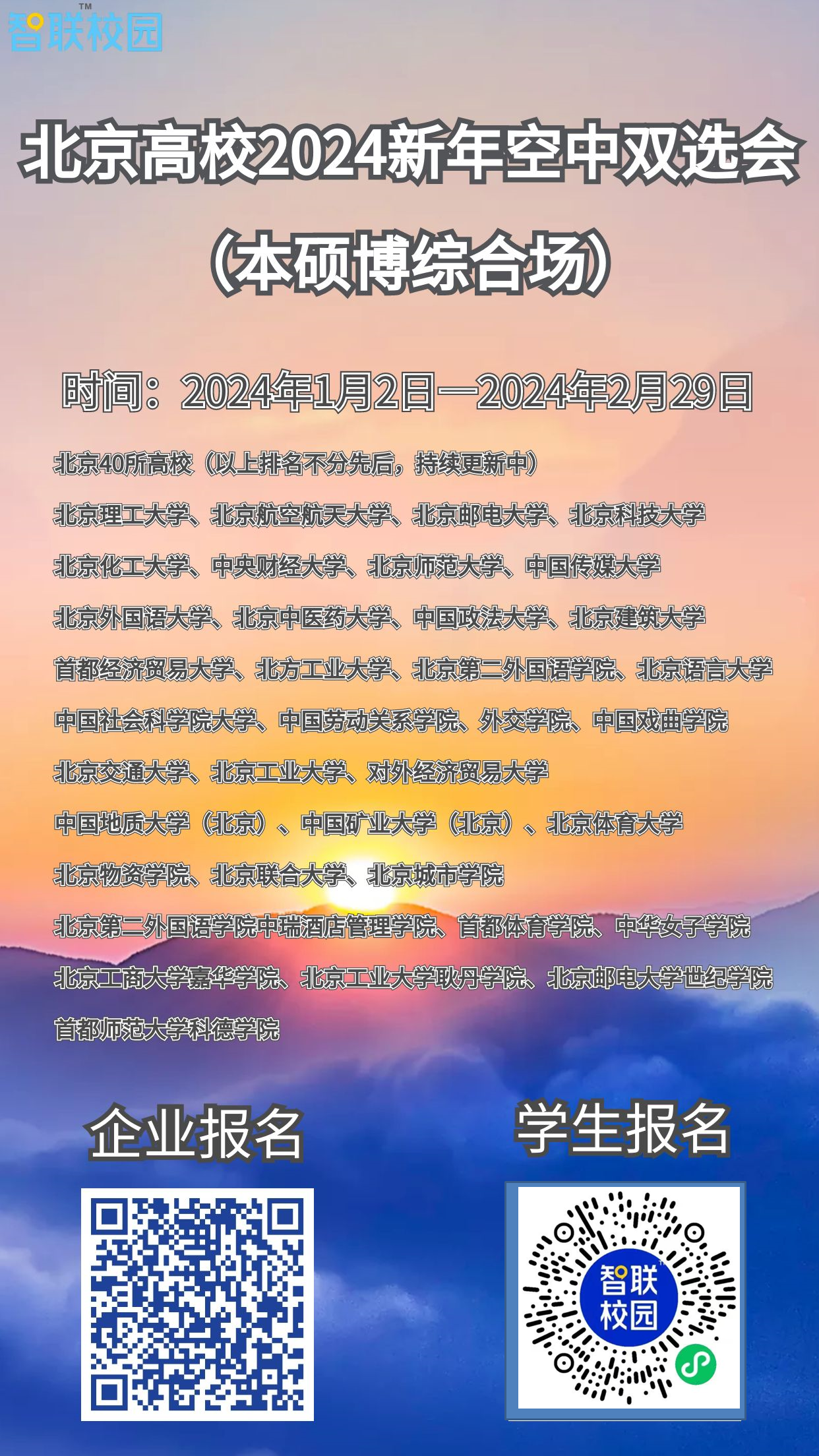 为全面贯彻落实全面落实党中央、国务院对高校毕业生就业创业工作的决策部署,更好地为用人单位和高校提供安全、便捷、高效地信息沟通和双向选择平台,抓住当前毕业生求职的关键期、冲刺期,全力促进高校毕业生顺利毕业、尽早就业。北京各高校联合举办大型空中双选会,2024年1月2日至2月29日 “北京高校2024新年空中双选会(本硕博综合场)”活动。现诚邀相关用人单位及同学报名参加,有关事项函告如下: