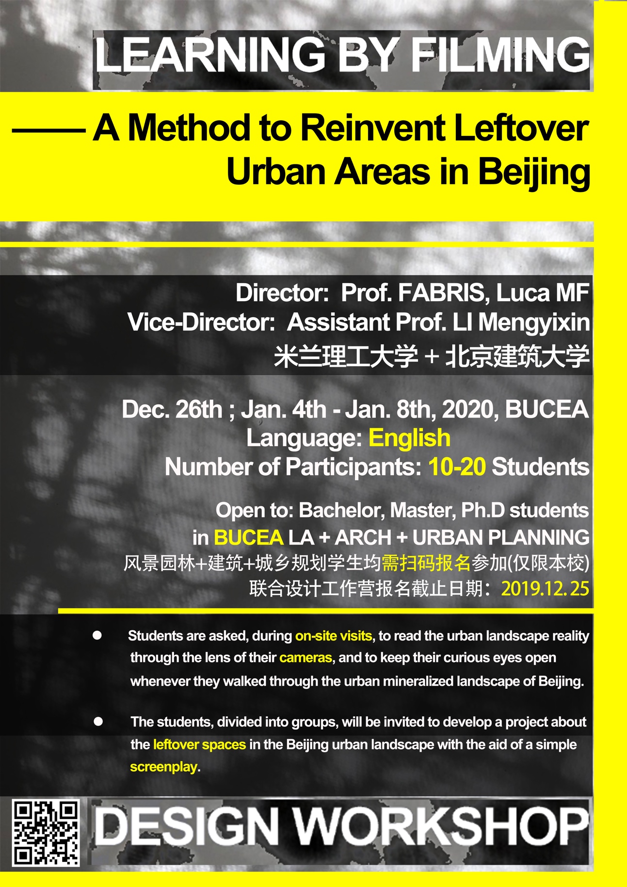 联合设计工作营通过专题讲座、场地参观调研、参与式影像处理的方式,引导学生发现、分析、讨论不断“新陈代谢”却又充满历史感的北京城市开放空间。千百年来,北京城一直经历着发展、变化和转型,在此过程中也不可避免地产生许多“剩余空间”(Leftover space)——场地丰富的历史信息丢失、空间因无法可持续利用而被遗弃、城市空间价值变弱等城市现象越来越突出。工作营将从环境设计和景观建筑技术的专业角度,通过参与式影像方法关注并探索当代大都市多层次开放空间的内涵与特征。