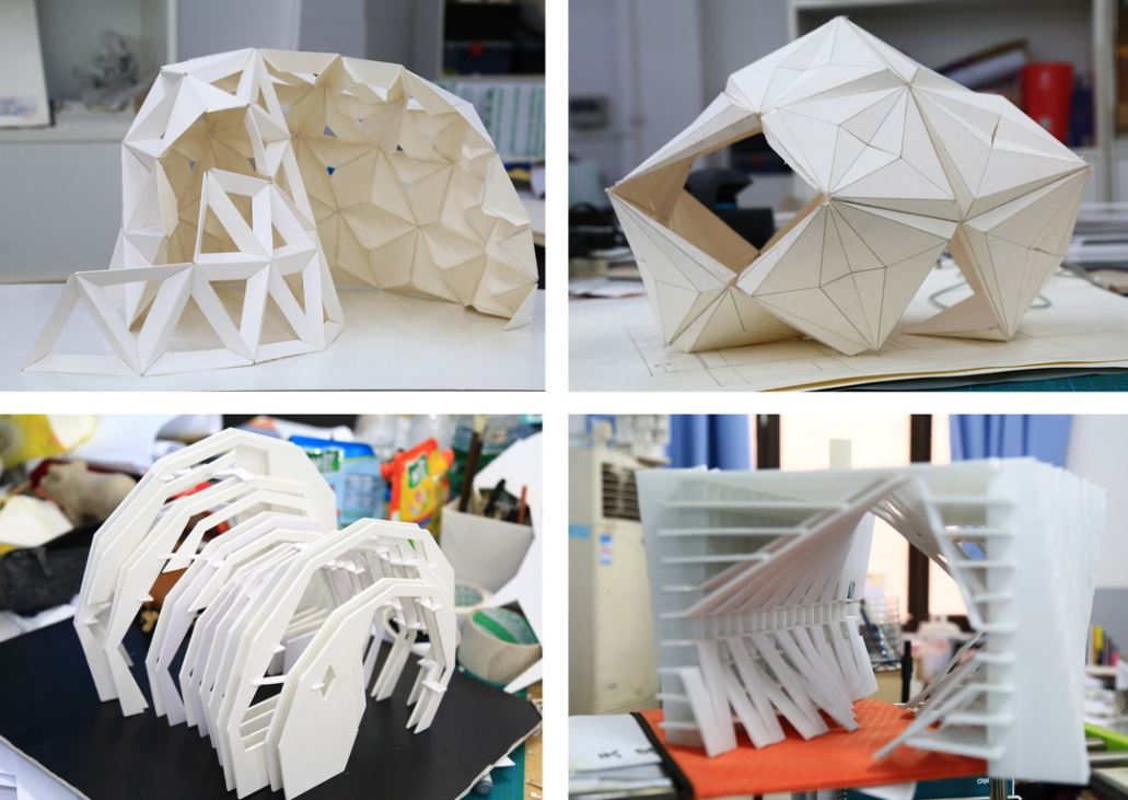 本次活动以建筑学院大一学生的设计初步课程教学内容为基础,在金秋野、齐莹等指导教师的带领下,开展了以“轻房子建造”为设计理念的 “建大·建造”空间课程设计。以四人为一组进行模型制作,仔细把握建筑使用功能、人体尺度、空间形态等基本要求。要求同学们从独立设计推敲到团队合作深化,最终共同将手中原本柔软的折纸样本一步步建造成可以遮风避雨的精致构筑。