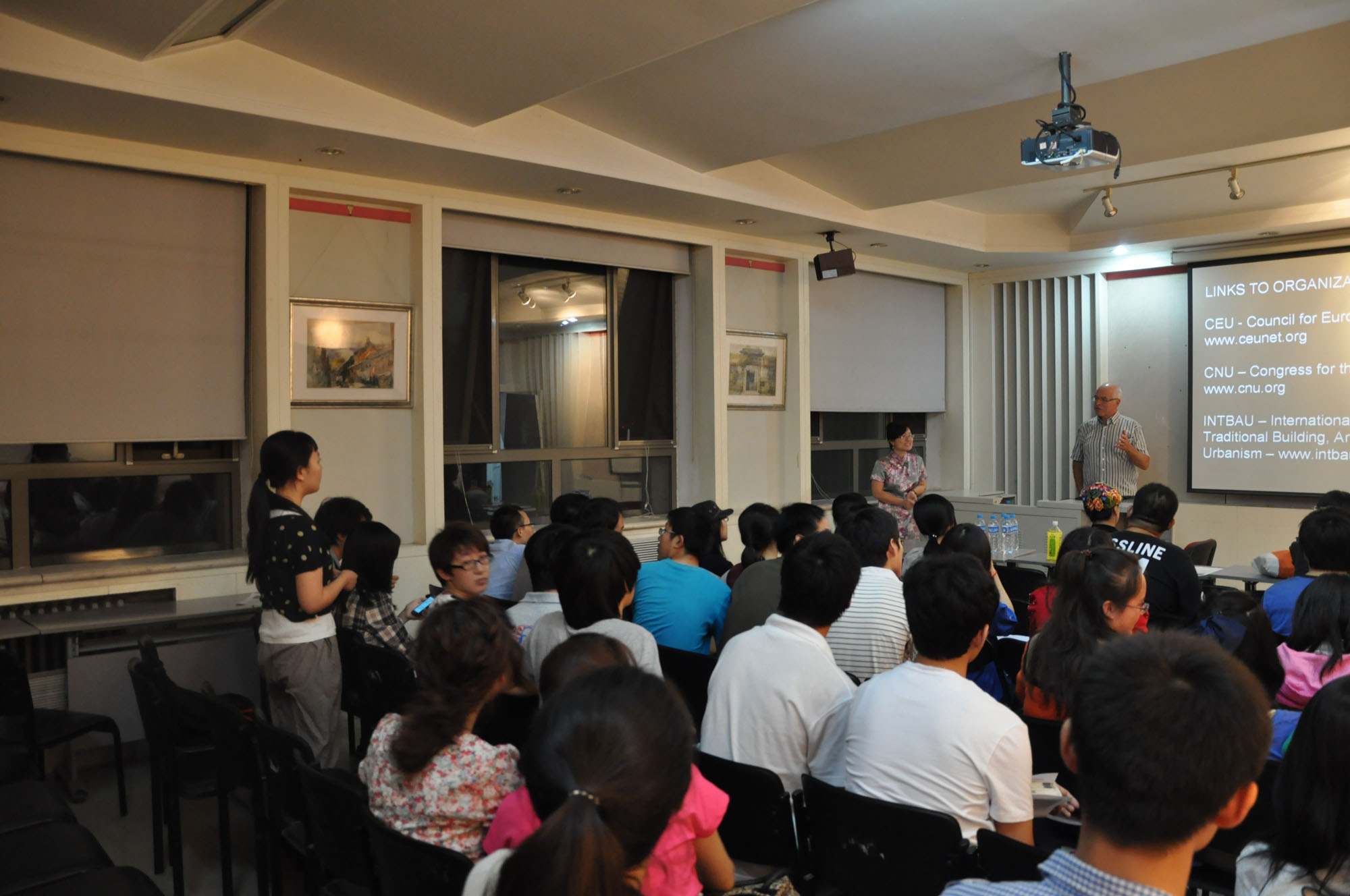 At 18:30 pm on September 17, 2012, Mr. AudunEngh, the expert from Norway, was invited by the School of Architecture and Urban Planning, at the BeijingUniversity of Civil Engineering and Architecture (BUCEA) to give a lecture in Urban Design with the title “New Urbanism and urban design based on community participation in US and Europe”. Dr. Chen WenZhe Cathleen, the assistant professor of the school of Architecture and Urban Planning translated the lecture.