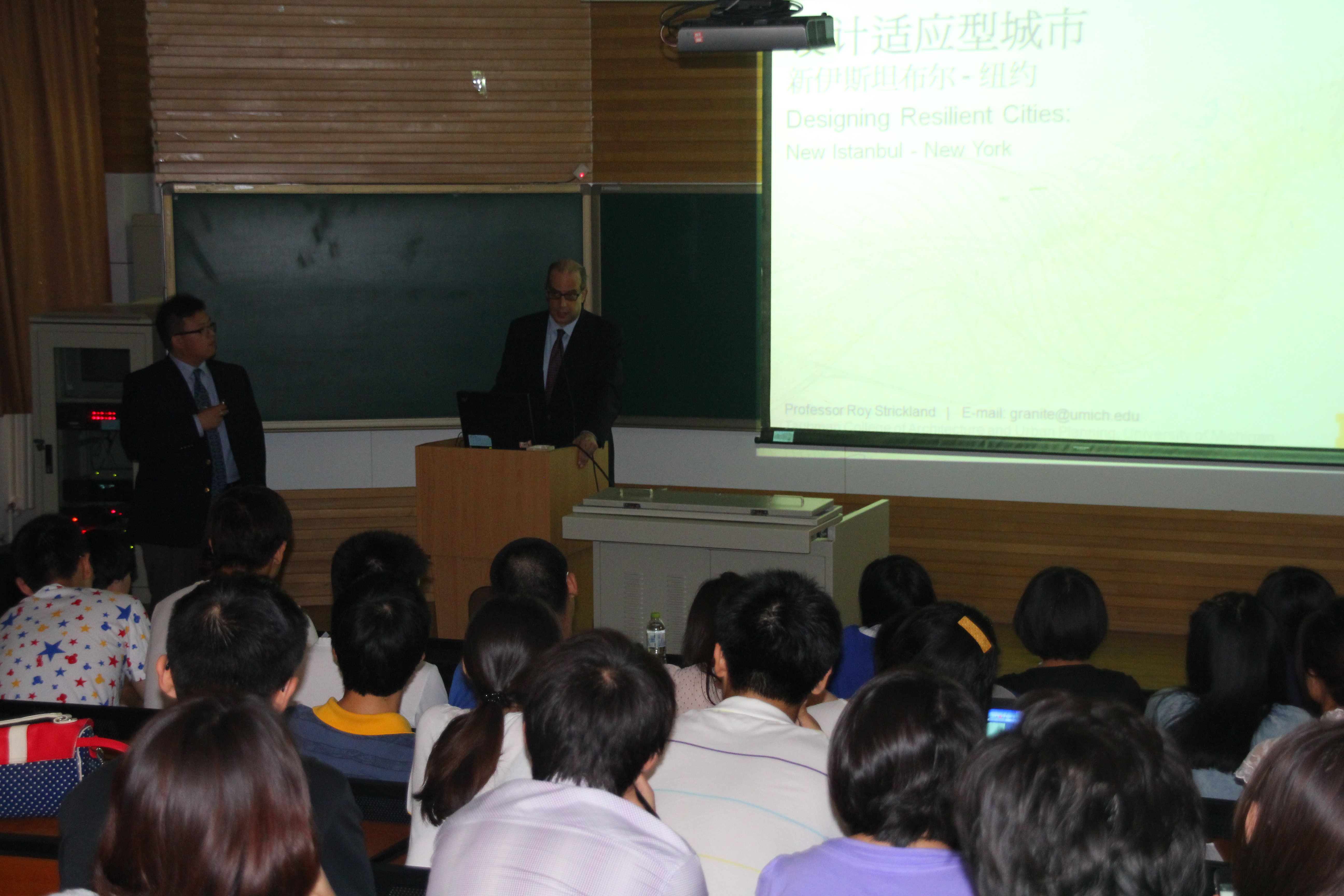 2013年6月26日,由校学生工作部主办、建筑与城市规划学院承办的 “我的中国梦之学术梦”系列主题教育活动中,建筑学院邀请到美国密歇根大学城市设计项目创始人、建筑学终身教授Roy Strickland先生,举办了以“弹性+可持续城市——纽约与伊斯坦布尔案例”为主题的学术讲座。建筑学院党总支副书记丁奇老师、团总支书记康健老师及广大师生参加了讲座。丁奇老师主持了本次讲座,我校05级毕业生现哈佛大学硕士钱睿做翻译。本次活动得到了《城市•环境•设计》杂志社和《中外景观》杂志社等媒体的支持和报道。
