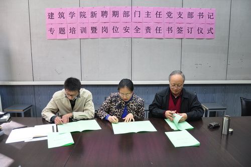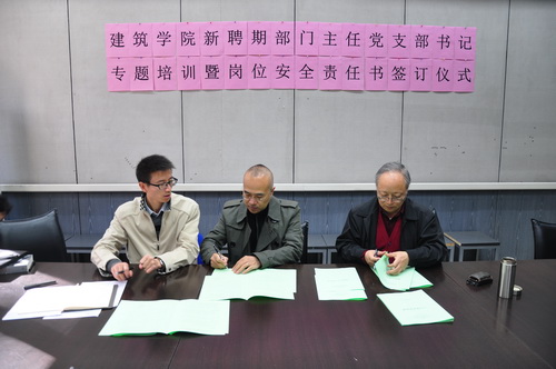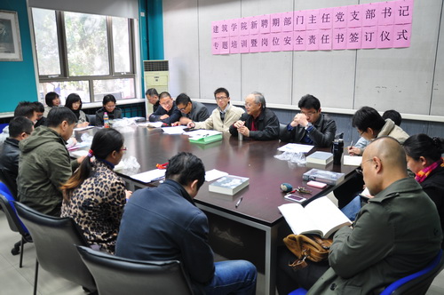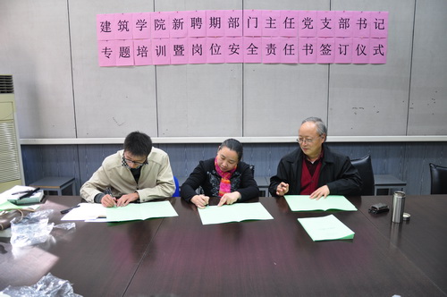 2013年10月29日中午,建筑学院召开由新聘期系(部、中心、室)主任、副主任教工党支部书记及科级岗人员等参加的专题培训会,并在会上签订了新聘期“安全稳定责任书”,学院党政班子全体成员参加会议并发言。
